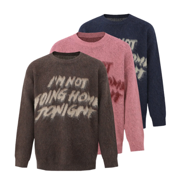 UNLOCK YOUR DRIP. A cozy sweater with attitude. Made from a soft fuzzy knit, it features the bold phrase “I’m Not Going Home Tonight” splashed across the front. Easy to throw on, super comfortable, and perfect for when you want your outfit to do the talking. Available in brown, pink, and navy for different moods.